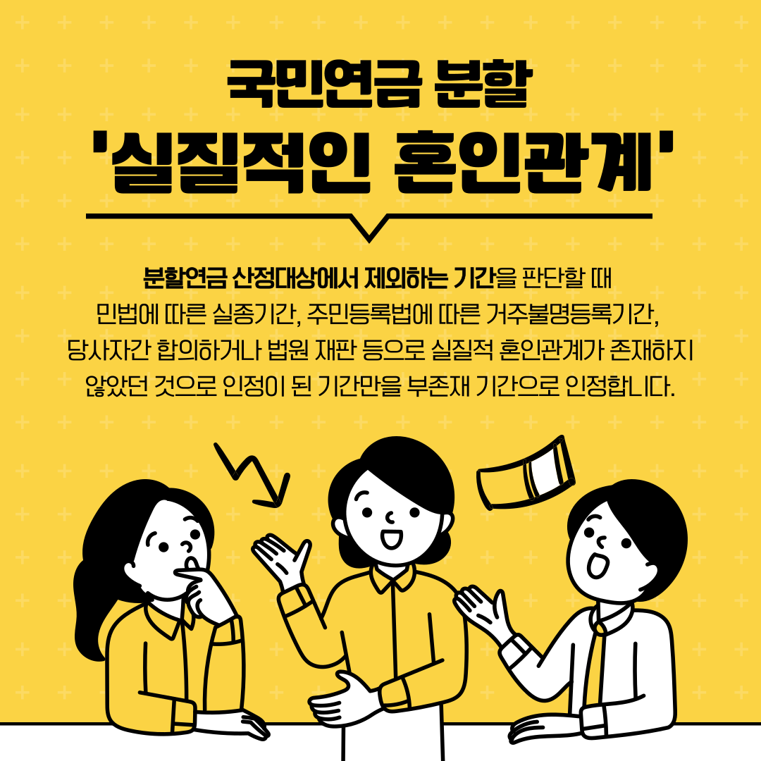 국민연금법 제64조 1항은 혼인기간을 ‘배우자의 가입기간 중의 혼인 기간으로서 별거, 가출 등의 사유로 인하여 실질적인 혼인관계가 존재하지 아니하였던 기간을 제외한 기간’이라고 하고 있습니다.