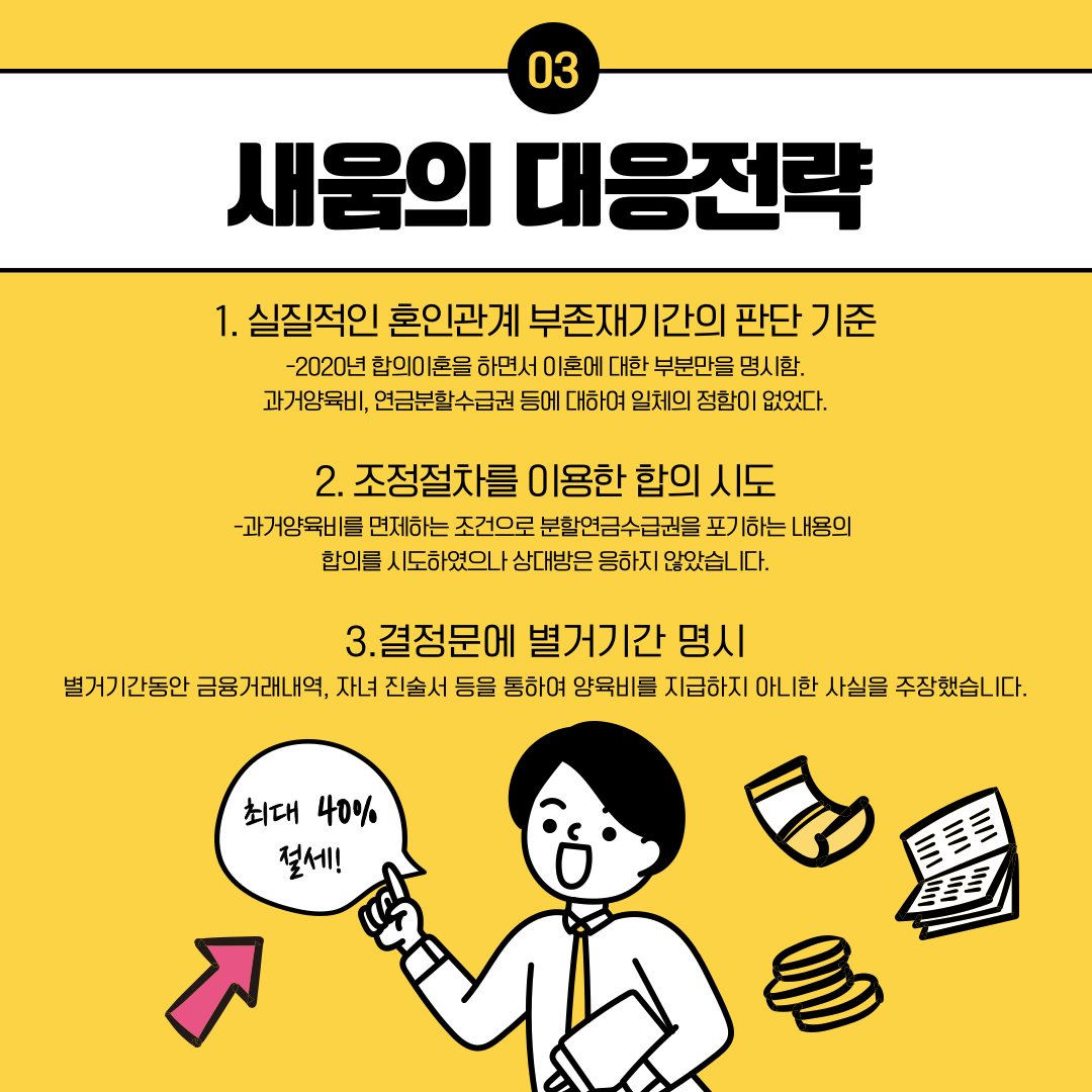 새움에서는 먼저 상대방이 과거 양육비를 전혀 지급하지 아니하였다는 점을 들어 과거양육비청구를 하면서, 상대방에게 과거양육비를 면제하는 조건으로 분할연금수급권을 포기하는 내용의 합의를 시도하였는데요. 상대방이 이러한 조정이나 합의에 응할 의사가 없다는 것을 밝혔기 때문에, 조정을 통한 합의가 아닌 정식 절차를 진행하게 되었습니다.