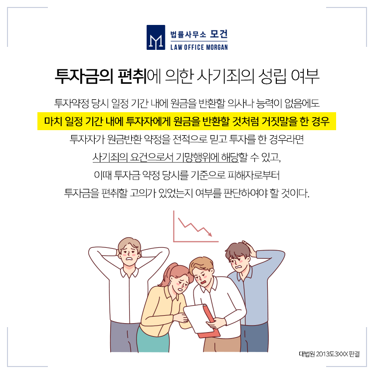 이에 피고인은 '주식투자로 수익을 창출하여 투자원금 및 수익금을 반환하려 하였으나 주식투자에 실패하여 약정을 이행하지 못했을 뿐이어서 사기의 고의나 기망행위가 없었다'고 주장했습니다.