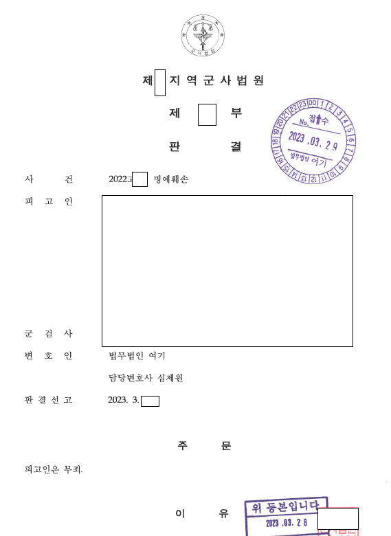 오늘은 로톡에서 선임한 사건으로 최근 선고된 군사법원 사건 중 명예훼손에 대해서 무죄판결이 선고된 성공사례를 포스팅합니다.