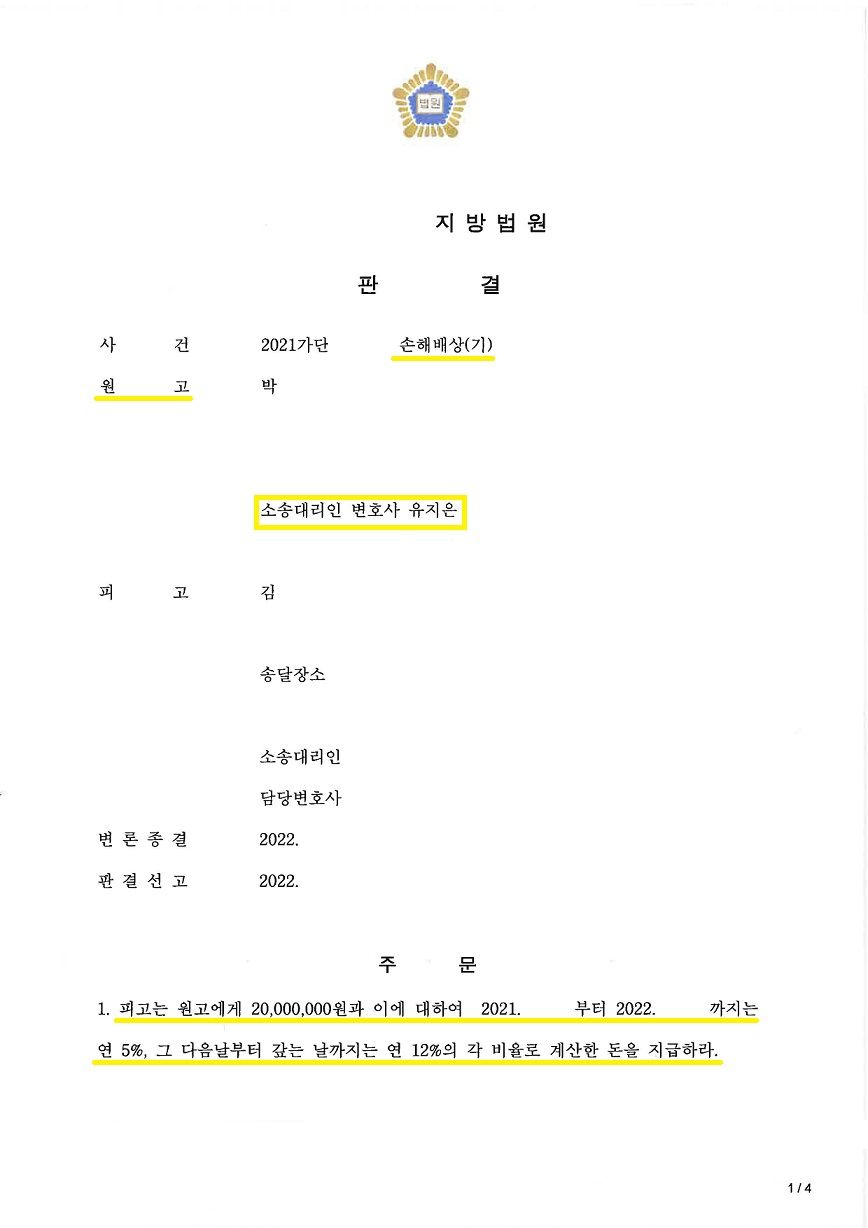 통상적으로 배우자를 피고에 포함하지 않고, 상간자만 상대로 위자료 청구를 할 경우 1천만 원에서 1,500만 원 상당의 위자료 액수가 나오는데, 이 사건에서는 위자료로 2천만 원을 지급받으며 성공적으로 마무리가 된 사안입니다.