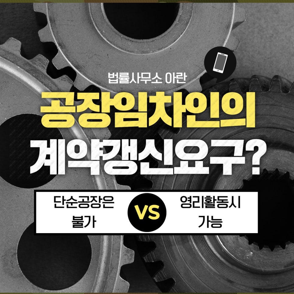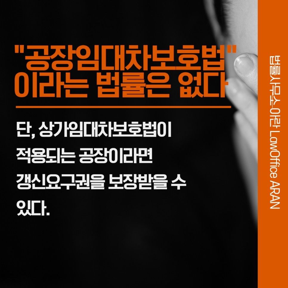 이렇듯 공장에 상가건물임대차보호법이 적용되는지 여부에 대해서는 판례가 통일되어 있지 않습니다. 그 이유는 서두에 말씀드렸듯이 공장임대차보호법이라는 법률은 존재하지 않기 때문인데요. 공장 임차인은 우회적으로 상가건물임대차보호법을 거쳐야만 계약 갱신요구권 등을 보장받을 수 있습니다.