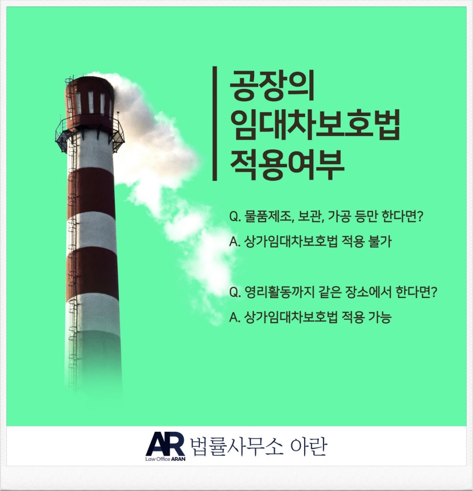 쉽게 말하면 어떤 공장에서 물건을 만들어내고 보관하는 등 '공장' 본연의 목적에 충실한 활동만을 하고 있다면 그 공장에 대해서는 상가건물임대차보호법이 적용되지 않습니다.