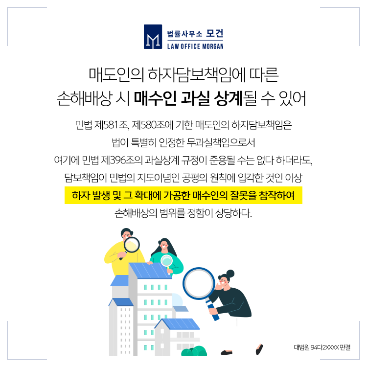 다만 매매목적물에 하자가 있는 이상 매도인은 그에 따른 손해를 배상할 책임이 있고, 원고의 과실책임을 일부 상계하여 이 사건 증축 부분을 원상회복하는데 소요되는 비용 중 80%를 인정, "피고는 원고에게 1,250여만원 및 지연손해금을 지급하라"고 판결하였습니다.