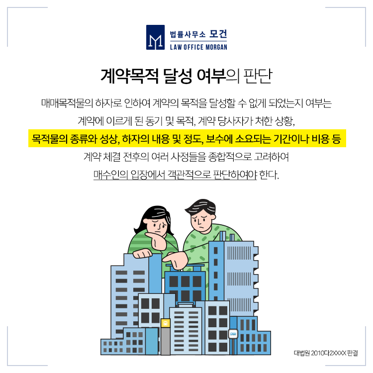 그러나 매수인이 하자있는 것을 알았거나 과실로 인하여 이를 알지 못한 때에는 그러하지 못하므로, 매도인과 매수인 간의 첨예한 대립이 발생할 수 있습니다. 부동산 분쟁은 그 피해액이 매우 큰 만큼 부동산전문변호사의 구체적인 자문과 대응책 마련이 중요합니다.