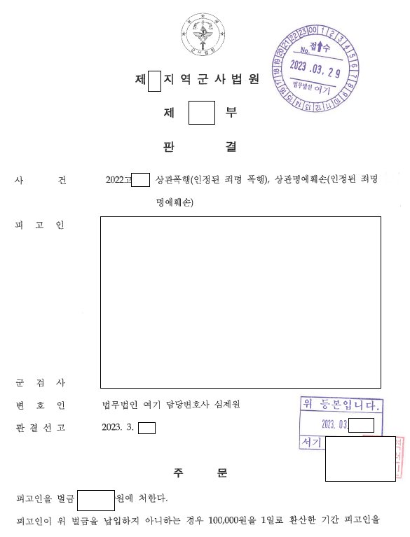오늘은 오랜기간 치열한 법리다툼을 했던 사건을 포스팅합니다. 바로 최근 많은 부대에서 문제가 되고 있는 대상관범죄에 대한 것이고, 그중 상관폭행과 상관명예훼손으로 기소가 된 경우입니다. 군형법상 대상관범죄는 전부 벌금형이 없기에 직업군인의 경우 유죄가 인정된다면 직업을 잃게될 뿐 아니라 퇴직금이나 연금도 절반으로 감액이 되게되어 그 형이 너무나 무겁습니다. 그래서 대상관범죄에 연루가 되었다면 반드시 처음부터 대응을 잘 하셔야 합니다.
