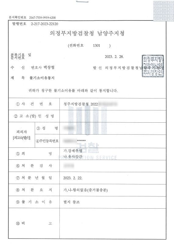 이후 피해자는 경찰의 결정에 항고하였으나 기각되었고, 이후 다른 증거를 수집하여 다시금 의뢰인을 고소하였으나 마찬가지로 증거 불충분으로 무혐의 불기소 처분되었습니다.