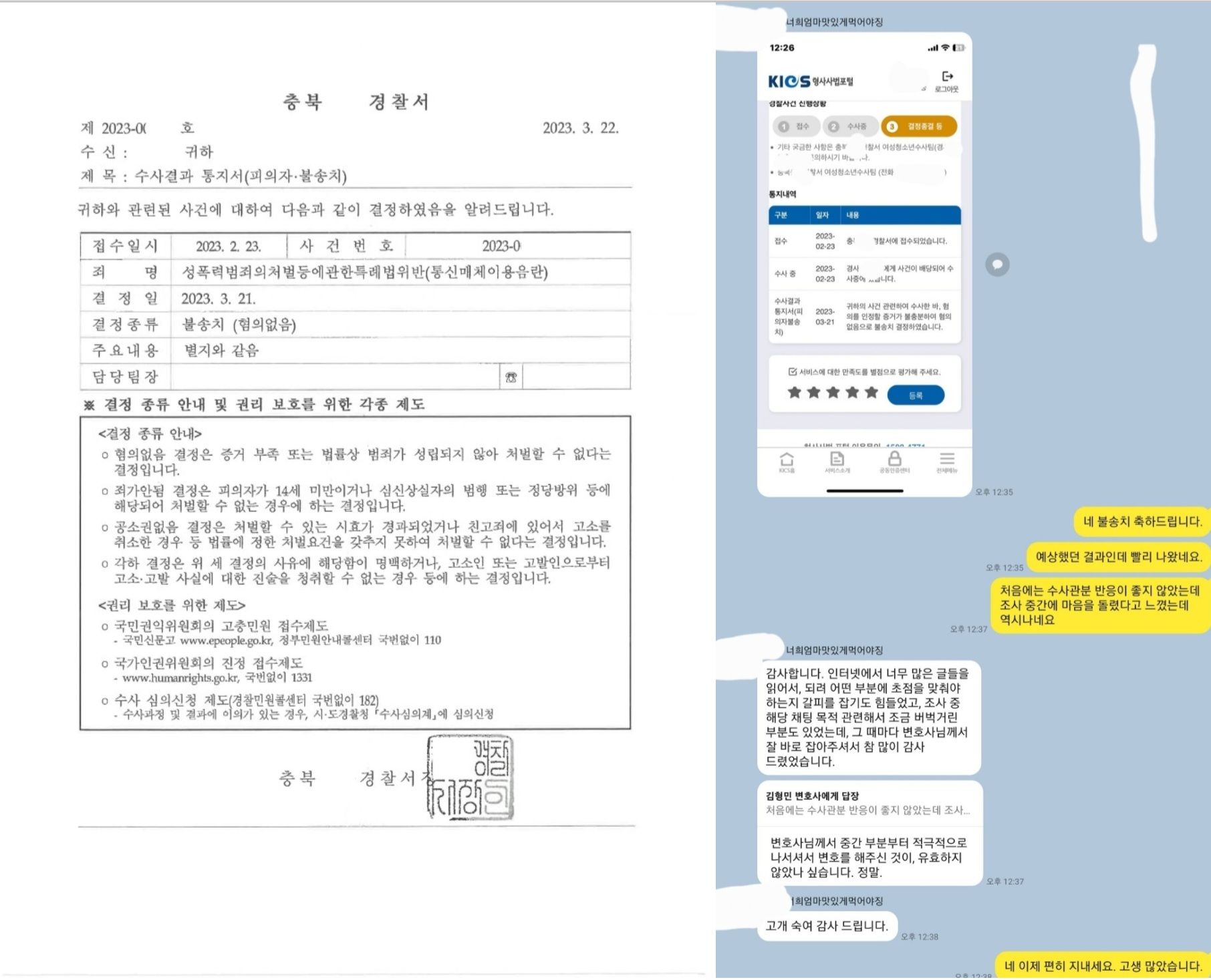 위 사건은 오픈채팅에서 성기사진을 전송한 건입니다. 처음 조사가 시작될 당시만 하더라도 불송치는 전혀 생각하지 않고 있다는 느낌을 받았습니다. 경남경찰청은 이 사건 조사입회 얼마 전에도 갔던 곳이었습니다. 이 사건 의뢰인은 기억나는 것이 거의 없었는데 다행히도 같은 고소인이 고소한 통매음 건을 변호하고 있었기 때문에 관련 자료는 확보하고 있었습니다. 이 사건보다 먼저 조사를 받았던 같은 고소인에 대한 통매음 건이 무혐의로 마무리되었고 이 사건에 제출하였습니다. 다행히도 이 사건 역시 혐의없음 불송치결정으로 마무리할 수 있었습니다. 이 사건의 고소인은 현재 구체적으로 밝힐 수는 없으나 이미 고소 건에 대한 혐의없음 불송치 결정이 내려진 이후임에도 핸드폰 임의제출 요구를 받은 상황이며 본격적인 수사로 진행될 가능성이 충분한 상황입니다.