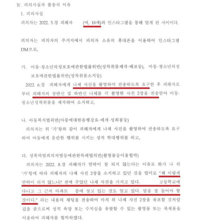그러다가 A씨는 B양에게 DM으로, 2022. 6.경 나체 사진을 촬영하여 전송하도록 요구하여 상반신 및 하반신 나체를 각 촬영한 사진 2장을 전송받고, 2022. 8.경 연락이 잘 되지 않자 화가 나 전에 전송받은 사진들을 소지하고 있고 고등학교와 주소를 알고 있으니 말을 잘 들어야 할 것이다는 취지로 협박하였습니다.