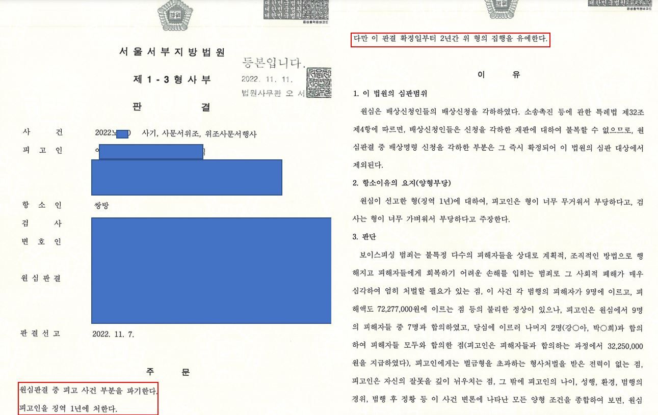 - 보이스피싱전달책(사기, 사문서위조, 사문서위조행사)