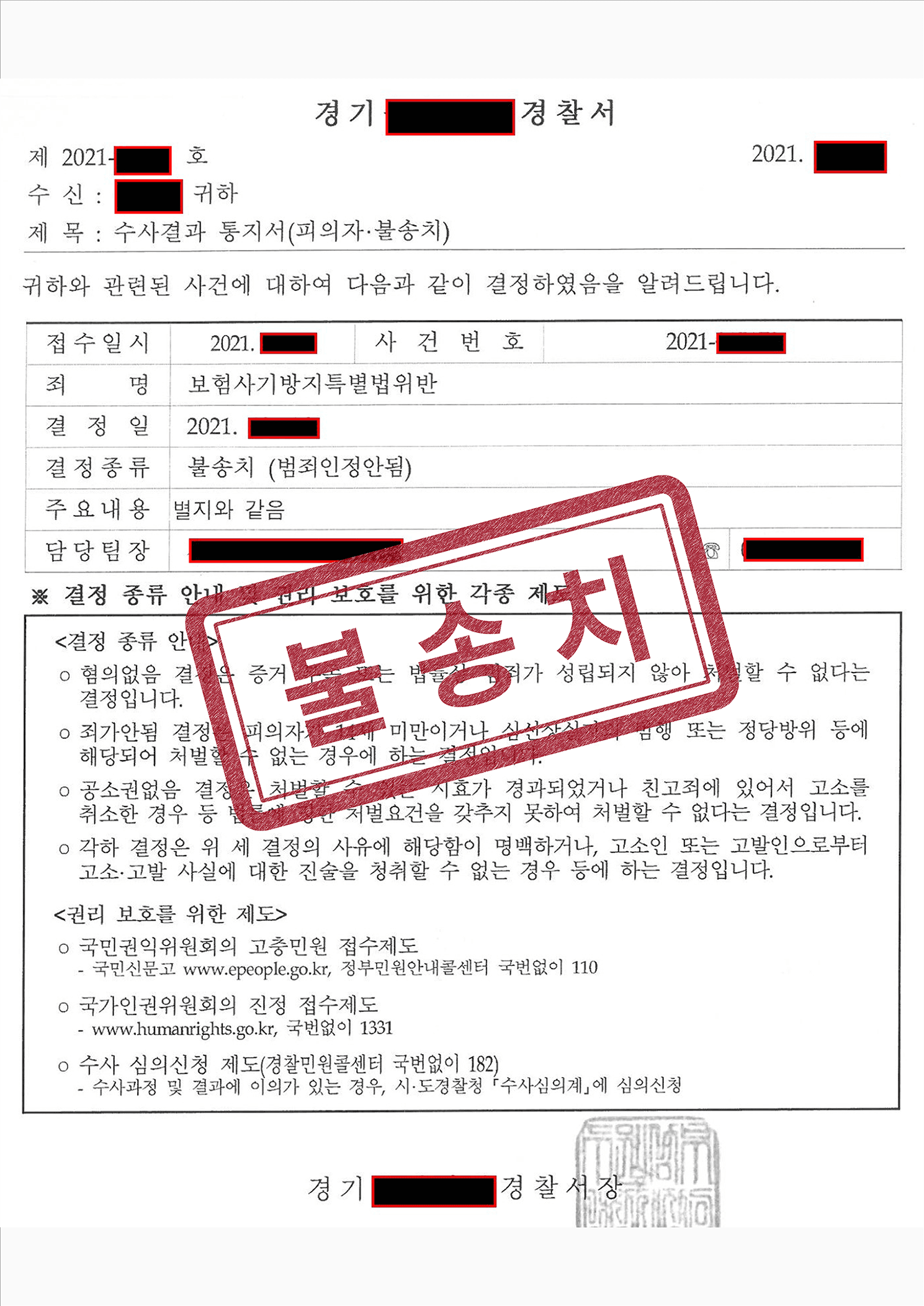 결국 해당 경찰서는 의료보조행위가 있더라도 진료수가 청구가 가능하다는 점 등을 근거로 불송치(혐의없음)처분을 하였습니다.