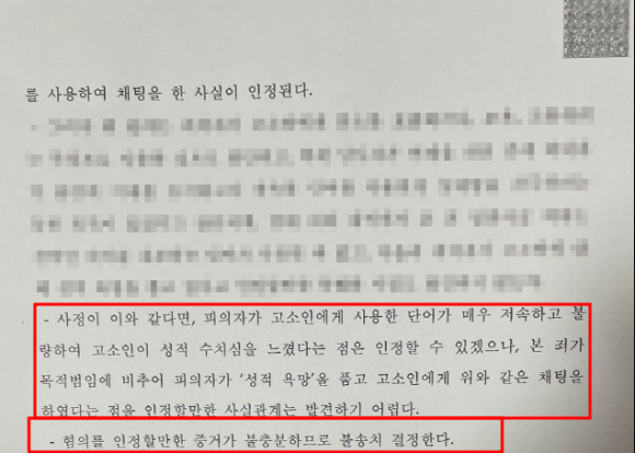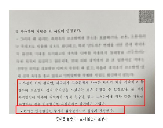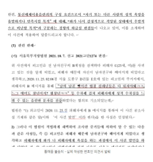 이 사건의 핵심 포인트는, 저희가 보유하고 있는 통매음 관련 하급심 판례 및 통매음 불송치에 대한 사례들을 인용하여, 의뢰인이 상대방에게 '걸레'라는 표현을 보낸 행위는 성적인 욕망을 유발하기 위한 목적이 아니였음을 법리적으로 논증하는 것이었습니다.