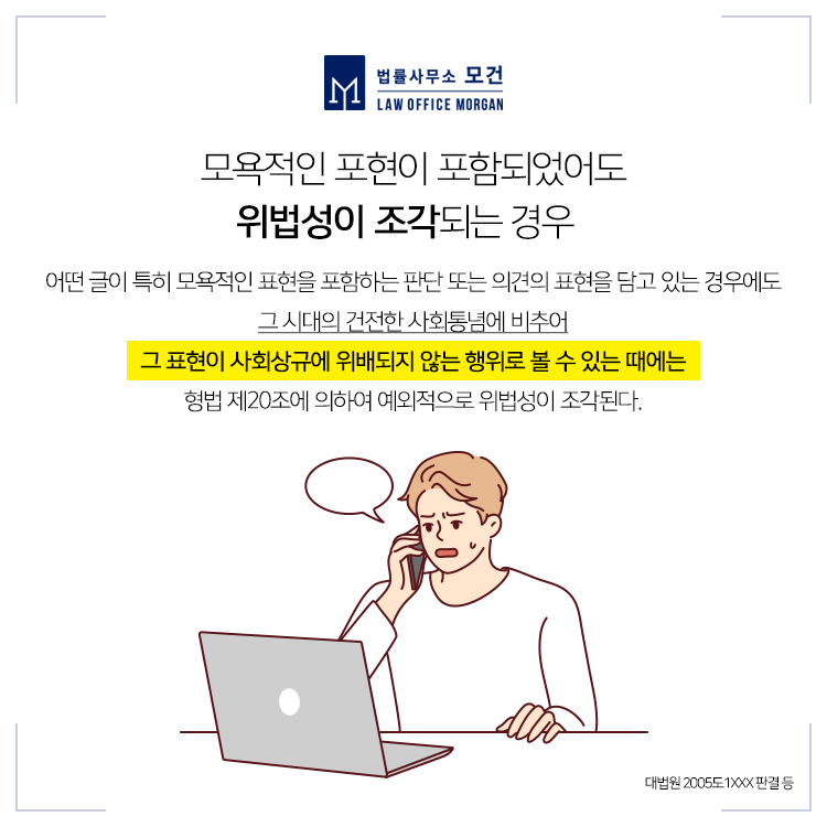 모욕죄는 특정한 사람에 대하여 사회적 평가를 저하시킬 만한 경멸적 감정을 표현함으로써 성립하므로 그 피해자가 특정되어야 합니다. 또 그 표현의 동기나 표현방법 등에 따라서도 결과가 달라지는 만큼 이에 대한 법리적 해석이 매우 중요합니다.
