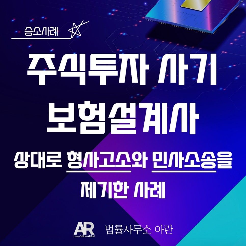 오늘 소개드리는 법률사무소 아란의 승소 사례는 보험설계사로부터 "주식에 투자해서 고수익을 내주겠다"라는 말을 믿고 투자를 하였다가 투자사기임을 확인한 후, 형사고소와 함꼐 민사소송을 제기한 사례입니다.