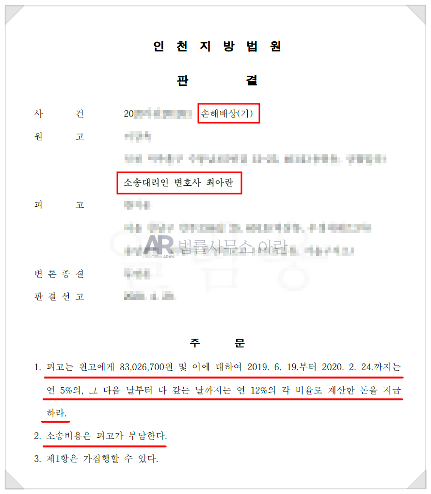 아울러 의뢰인은 상대방에게 손해배상청구 소송을 제기하여 지급한 원금 전액 중 수익금을 제외한 나머지 원금에 대하여 승소 판결을 받았습니다.