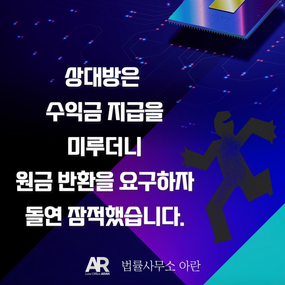 이에 의뢰인은 상대방에게 수익금 지급이 어려우면 그동안 지급받은 원금만이라도 반환해달라고 했습니다. 그러자 상대방은 돌연 의뢰인과의 연락을 끊고 사라졌습니다.