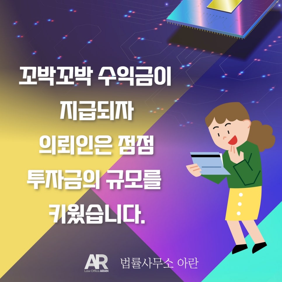 이렇게 꼬박꼬박 수익금이 지급되자 의뢰인은 어느덧 수중에 있는 돈은 물론이고 주변 사람들의 돈까지 끌어다 거액의 투자를 하기 시작했습니다.