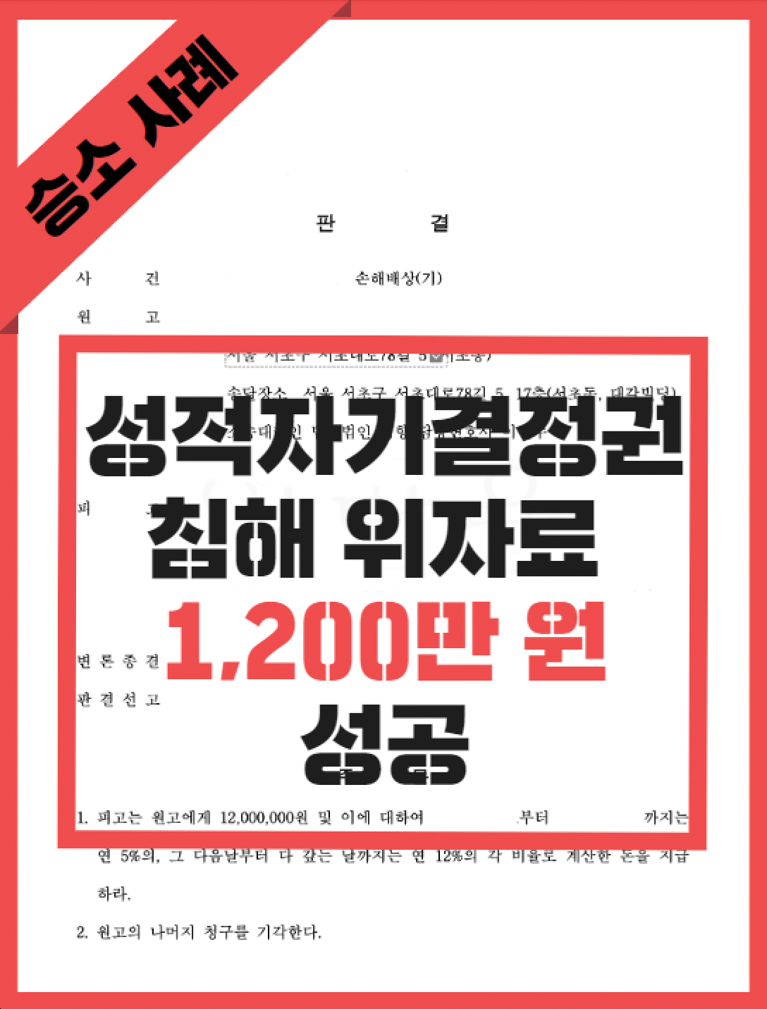소송 결과는 a의 승소였습니다. a는 b를 상대로 위자료 1,200만 원에 성공하였습니다.