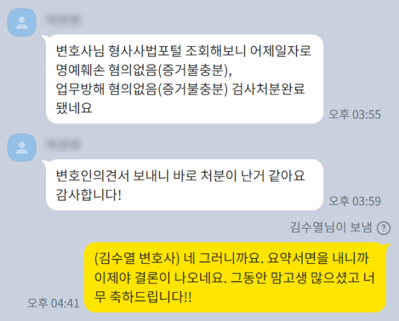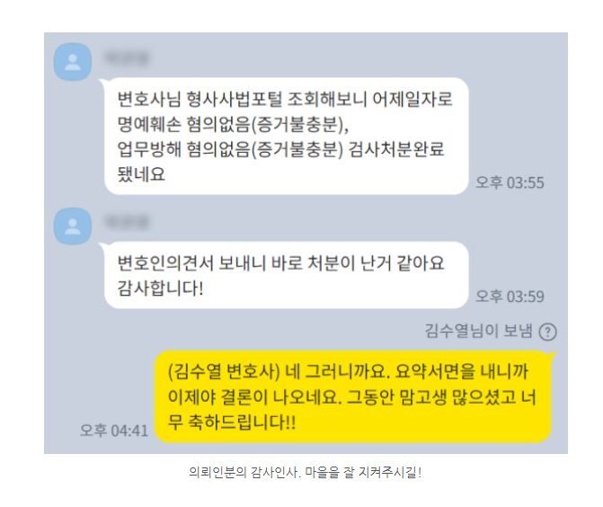 의뢰인분은 고소를 당한게 너무 억울했고 혹시나 처벌을 받을까 걱정했는데 무사히 잘 해결이 되어서 너무 안도하고 좋아하셨습니다.