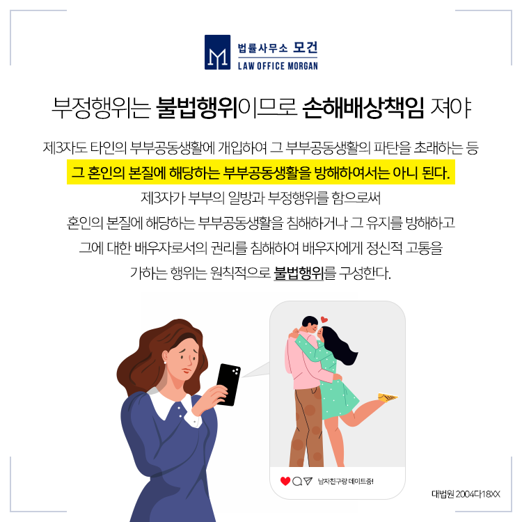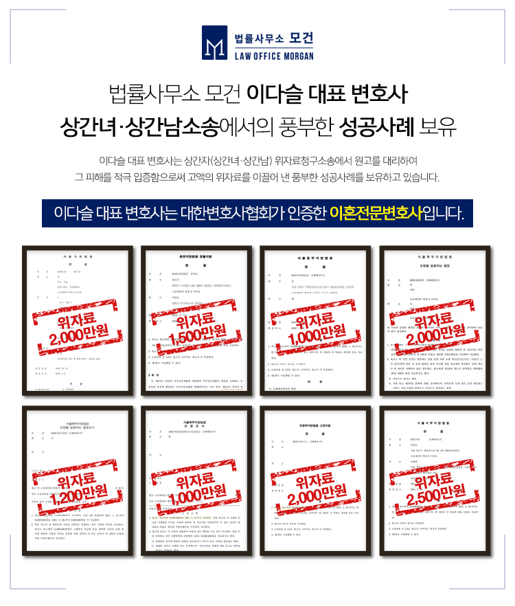 법률사무소 모건의 이다슬 대표 변호사는 외도이혼과 상간녀소송과 상간남소송을 전문으로 진행하고 있습니다. 서울, 경기, 인천 등 상간녀소송전문변호사의 도움이 필요하신 분들은 법률사무소 모건으로 문의하시기 바랍니다.
