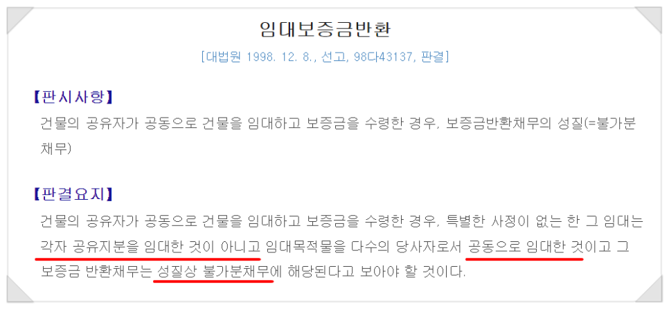대법원은 "건물의 공유자가 공동으로 건물을 임대하고 임차보증금을 수령한 경우 특별한 사정이 없는 한 그 임대는 각자 공유지분을 임대한 것이 아니라 임대목적물을 다수의 당사자로서 공동으로 임대한 것이고 임차보증금 반환채무는 성질상 불가분채무에 해당한다."라고 판시하고 있습니다.