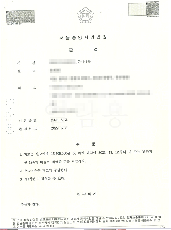 통상의 공사대금 사건과 같이 구두 계약만이 존재하는 상황이라 위 구두 계약의 존재를 입증하는데 어려움을 겪은 사건입니다. 그러나, 결국 승소하였고, 특히 부동산에 대한 강제경매로 인하여 채권액 전액 및 소송비용까지 회수할 수 있었기에 성공적인 사례로 판단합니다.