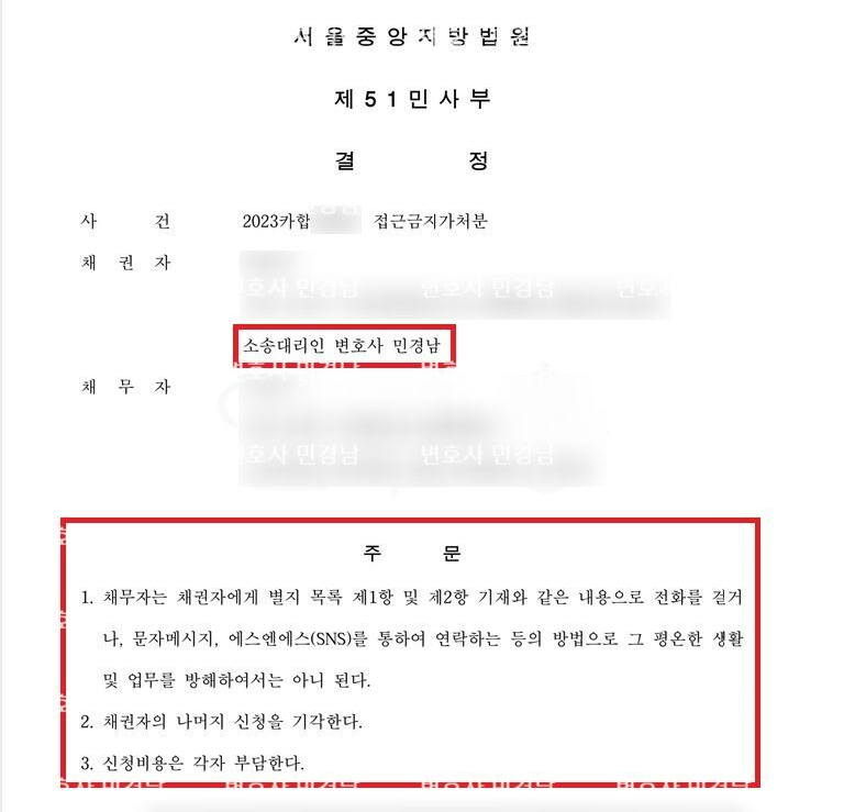 접근금지가처분이 인용될 경우, 더 이상 채무자는 채권자에 대하여 일체의 접근 또는 연락이 금지되게 되고, 이를 위반할 경우 간접강제로서 1회당 일정 금액을 금전으로 지급하는 방식으로 집행력을 확보하게 되므로 상대방에 대하여 상당한 심리적 압박을 가질 수 있게 됩니다.