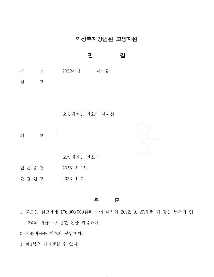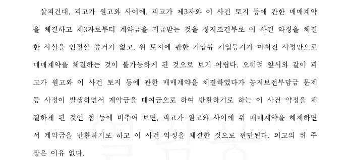 저는 의뢰인에게 기존에 지급한 계약금을 대여금으로 하는 약정서를 쓰게 하였고, 이를 통해 의뢰인은 기존의 매매계약을 대여금 계약관계로 변경할 수 있게 되었습니다. 애초부터 매도인은 농지보전부담금의 존재를 숨기고 매매계약을 체결하게 했으므로 대여금에 대해서도 제대로 된 이행을 하지 않았습니다. 이에 매도인에 대하여 대여금 반환청구를 하여 전부 승소판결을 이끌어 냈습니다.