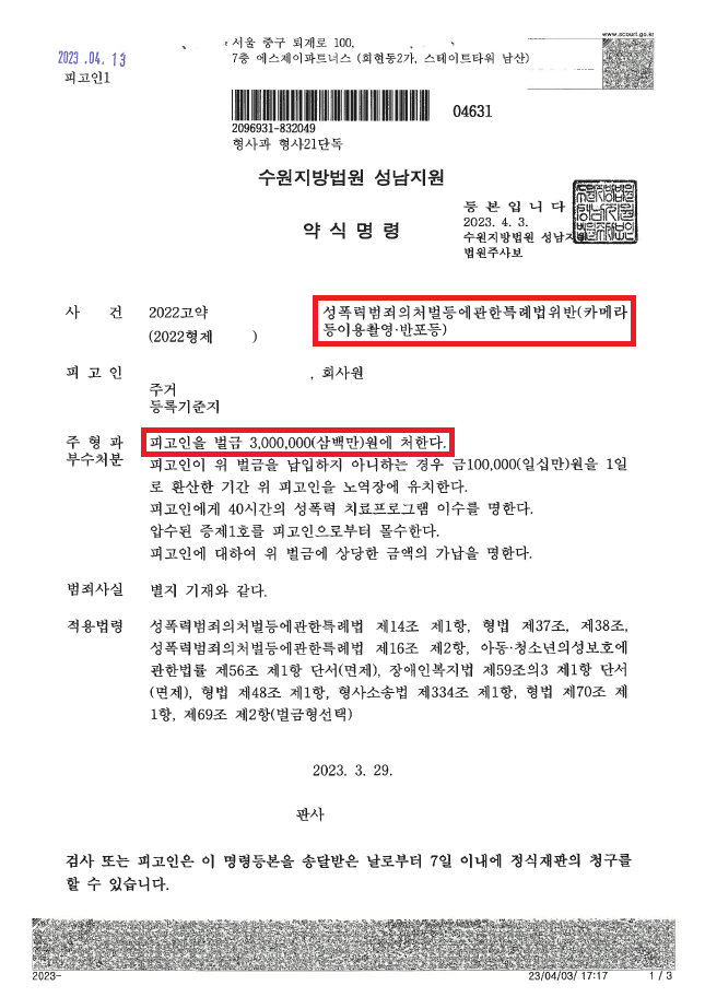 이러한 저의 조력을 바탕으로 A씨는 불특정 다수의 여성들을 대상으로 범행을 저질렀음에도 불구하고 약식명령으로 벌금형을 선고받음으로써 재판까지 나아가지 않고 사건을 최대한 가볍게 마무리할 수 있었습니다.