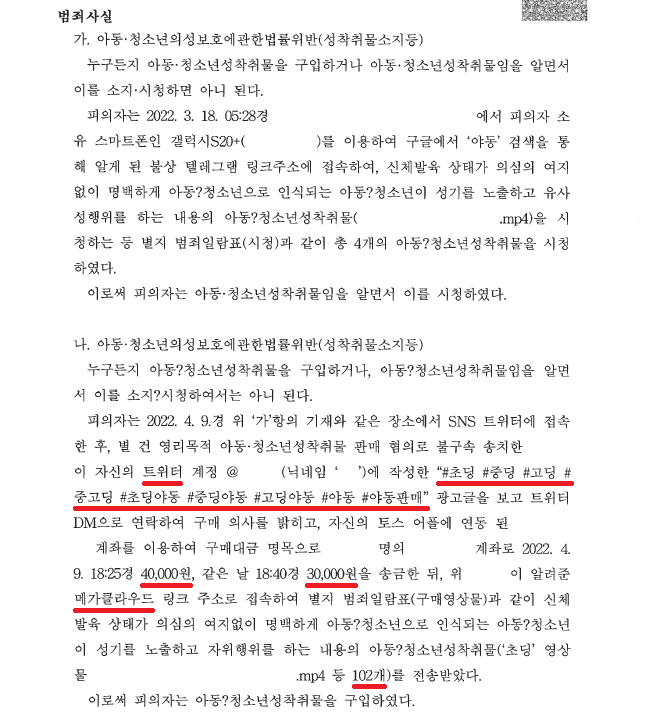 A씨는 2022. 4. 9.경 음란물을 구매하기 위해 트위터를 하다가 B씨가 게시한 "초딩, 중딩, 고딩, 중고딩, 초딩야동, 중딩야동, 고딩야동, 야동, 야동판매" 광고글을 발견하고 B씨에게 DM(Direct Message)으로 연락하여 구매의사를 밝힌 뒤 40,000원, 30,000원을 송금하여 총 2회에 걸쳐 아동·청소년성착취물을 구매하였습니다.