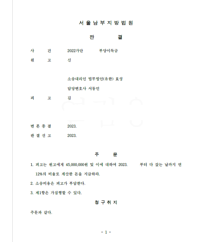 저는 즉각 입금 받은 자를 피고로 하여 민사소송 부당이득반환청구소송을 제기하였고 법원은 저희의 주장을 받아 들여 원고 전부 승소 판결을 선고하여 의뢰인은 피해액을 반환받게 되었습니다.
