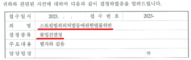 수사기관의 본격적인 조사가 이루어지기 전 처벌불원서가 제출되어 수사기관은 의뢰인에 대한 스토킹범죄의처벌등에관한법률위반의 점에 대하여 '불입건' 결정을 하였습니다.