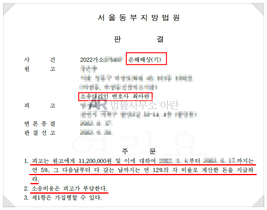 재판부 역시 최아란 변호사와 생각이 같았습니다. 재판부는 집주인의 주장을 일언지하에 배척하고, 의뢰인 전부 승소의 판결을 선고하였습니다.