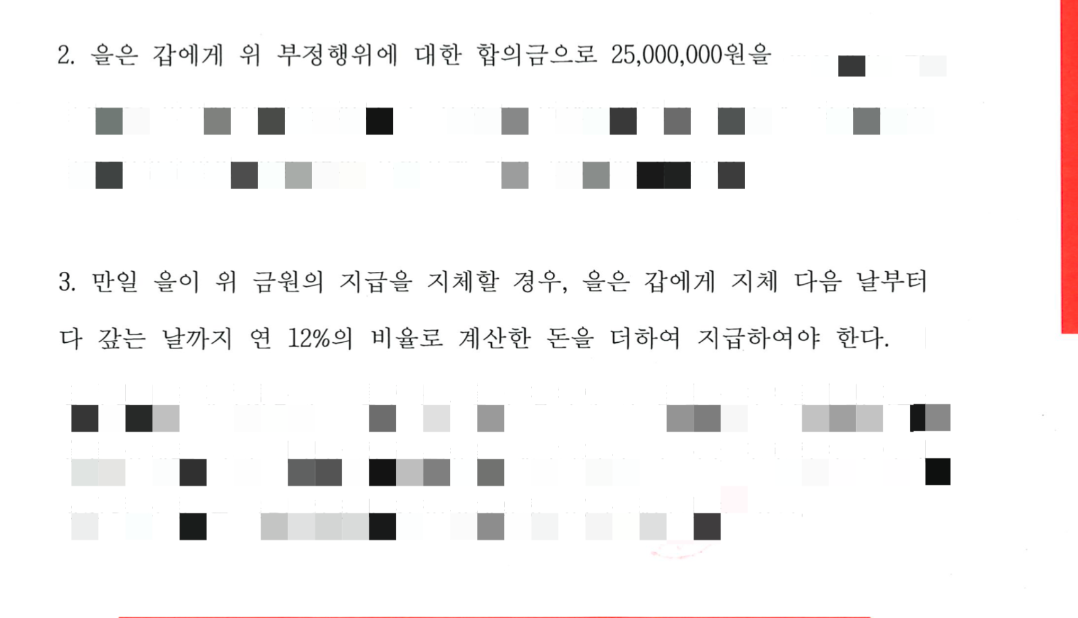 의뢰인은 2,500만 원의 합의금을 받았고, 이 과정에서 저의 조력 하에 합의서의 내용 또한 의뢰인에게 아주 유리한 내용으로 작성됐습니다. 특히 합의서에 따라 b는 더이상 a에게 연락을 할 수도, 만날 수도 없었으며, 업무를 이유로 연락한다고 해도 약정을 어긴 행위로서 상당한 금원을 지급하도록 하는 조항까지 포함하였습니다. 즉 의뢰인은 본 건 합의로서, 판결금 이상의 합의금을 지급받았을 뿐만 아니라, b의 추가 부정행위까지 예방할 수 있는 방안을 마련한 것입니다.