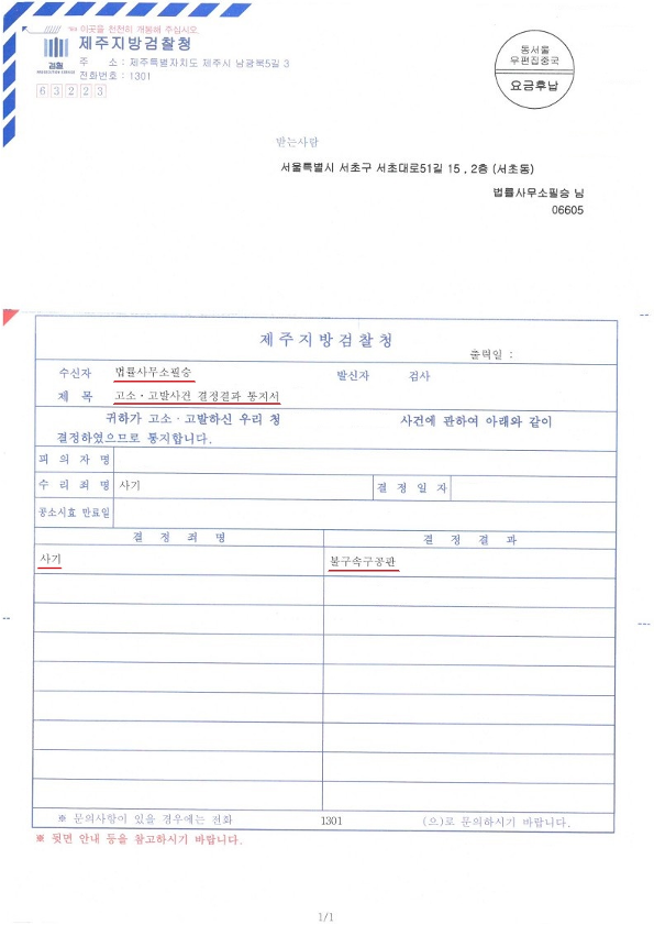 다만 사기죄는 합의가 이루어져도 죄가 인정되면 처벌도 이루어지기 때문에 제주지방검찰청은 피의자를 불구속구공판(기소)하였습니다