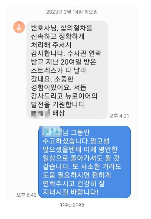 또한 합의금을 입금하고 최종 합의서를 교부받고 고소취하서를 제출하도록 하는 등 남은 복잡한 절차를 문제없이 신속히 진행해드렸는데요. 합의서에 간혹 '중요 문구'가 빠져있거나 '불리한 조항'이 있을 수도 있으니 마지막까지 꼭 다시 한번 확인해보아야 합니다.