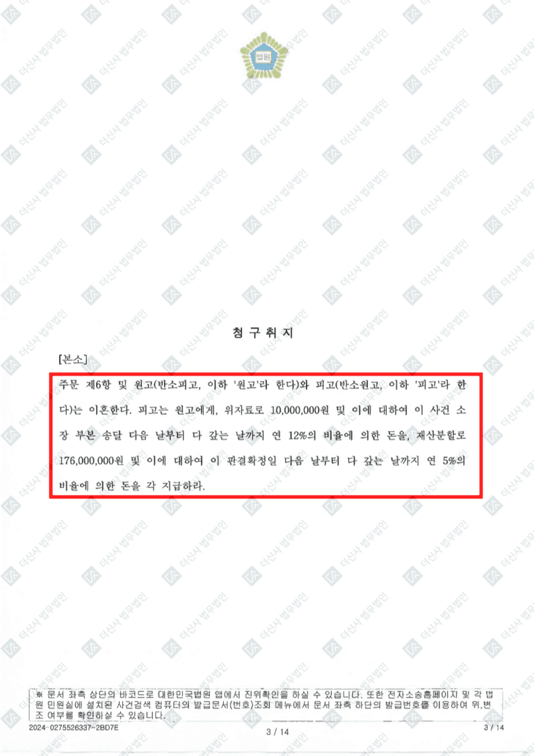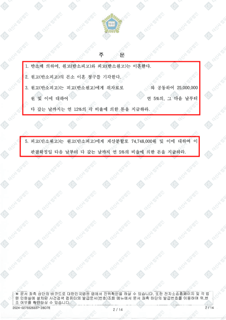 의뢰인분은 재산분할에서 75%의 기여도를 인정받아 남편의 재산분할 청구액 중 60% 이상을 방어하고, 위자료 2,500만원을 인정받았습니다. 또한 양육권과 친권도 모두 확보하였습니다.