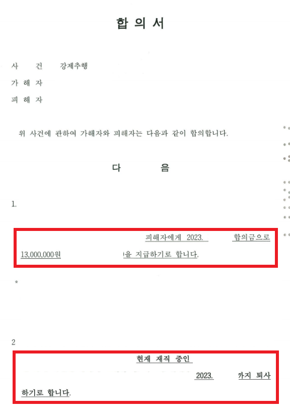 적절한(의뢰인께서 원하시는 금액) 피해 배상 및 원하는 내용으로 합의를 진행해드린 사안입니다.