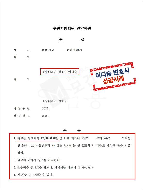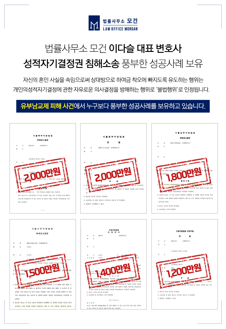 또 원고는 피고의 혼인사실을 알게된 후 즉시 만남을 중단하였는데, 피고의 이러한 기망행위가 없었다면 피고와 연인관계가 되고 성관계를 맺지 않았을 것이며, 그로 인해 원고가 입은 정신적 고통이 매우 크다는 점을 주장하였습니다. 그결과 법원으로부터 1,200만원의 위자료를 인정받을 수 있었습니다.