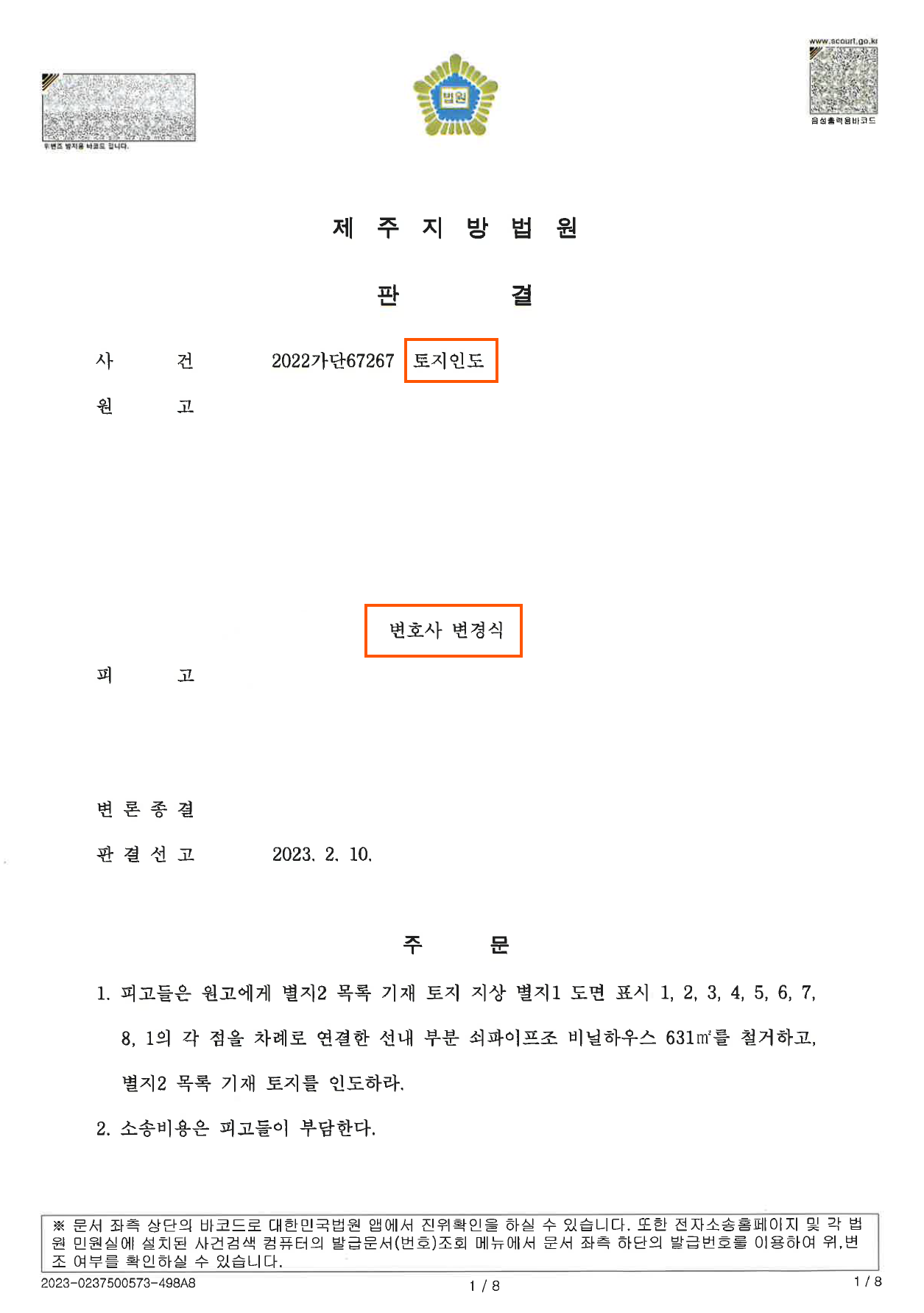 결국 원고의 청구취지 그대로 전부승소 판결이 나 토지의 원상회복을 받을 수 있었습니다.