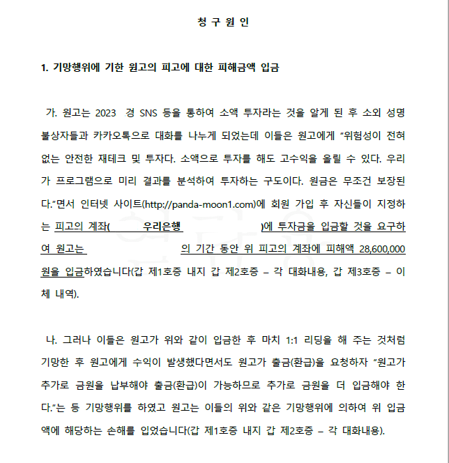 이 사건에서도 의뢰인은 투자 사기를 당하여 피고에게 피해액을 입금하였고 이를 돌려받기 위해 저를 찾아오셨습니다.