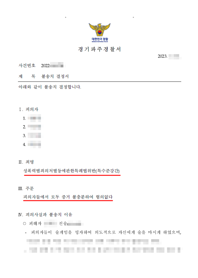 - 결국 경찰은 보완수사를 거친 뒤, 기존의 '송치의견'을 변경하여 '무혐의 불송치'의견으로 사건을 검찰에 올렸습니다.