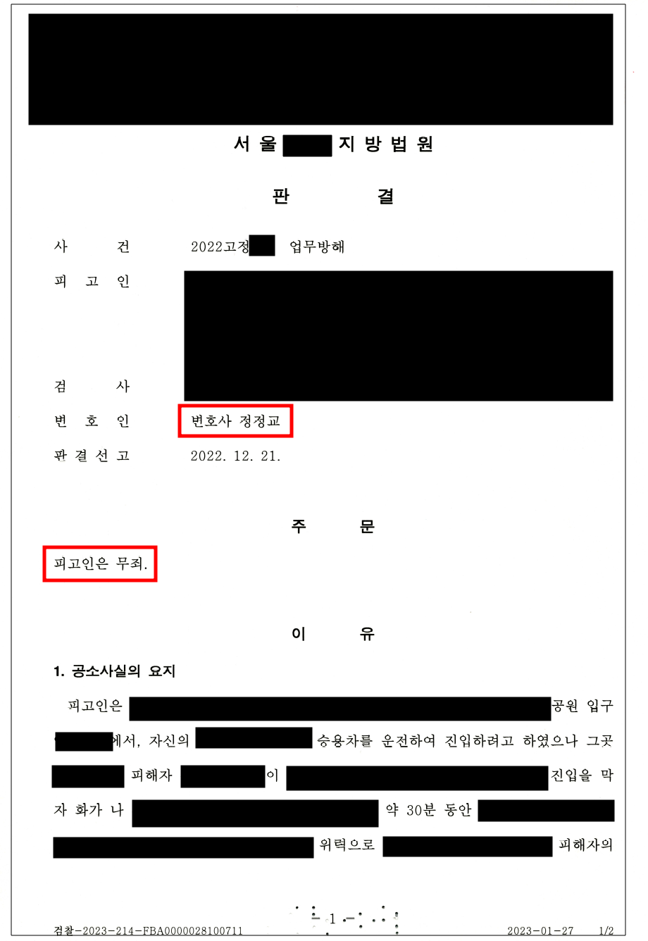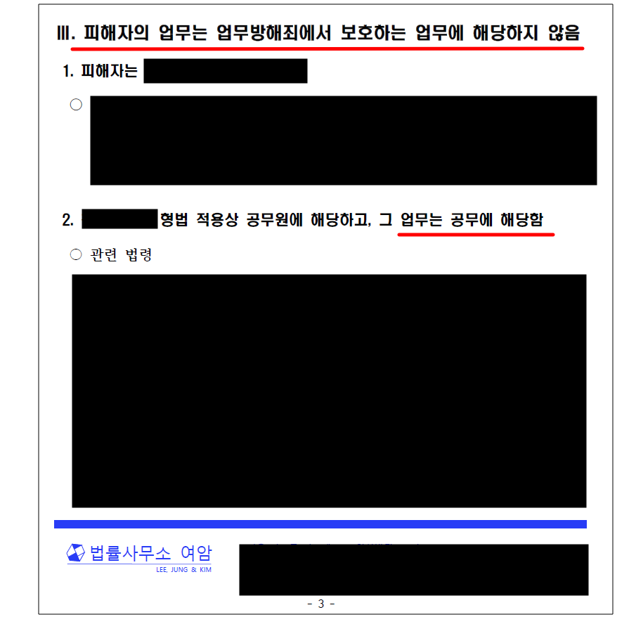 - 이에 정정교 변호사는 '이 사건의 업무는 업무방해죄에서 보호받는 업무가 아닌 공무임'을 재판부에 피력하였고, 재판부도 이에 수긍하였습니다.