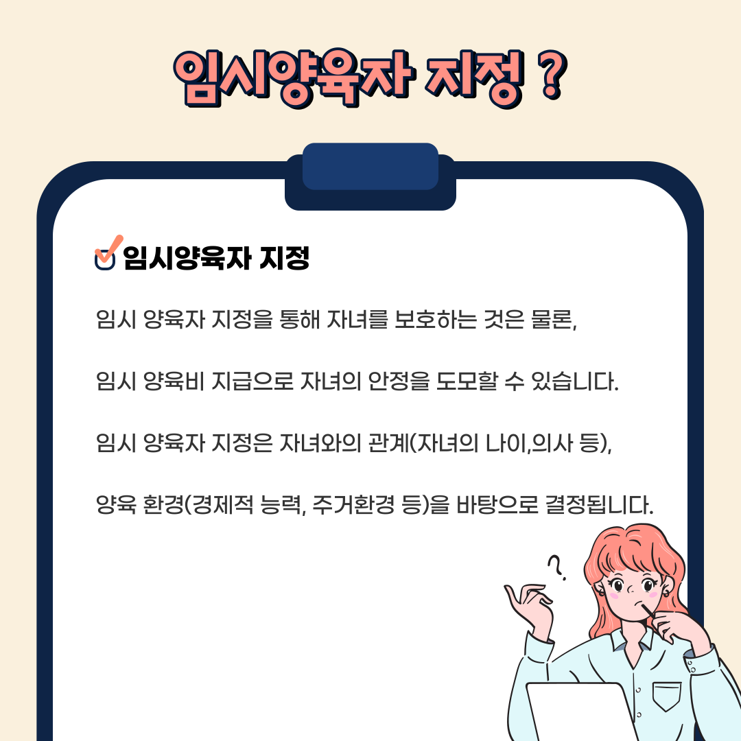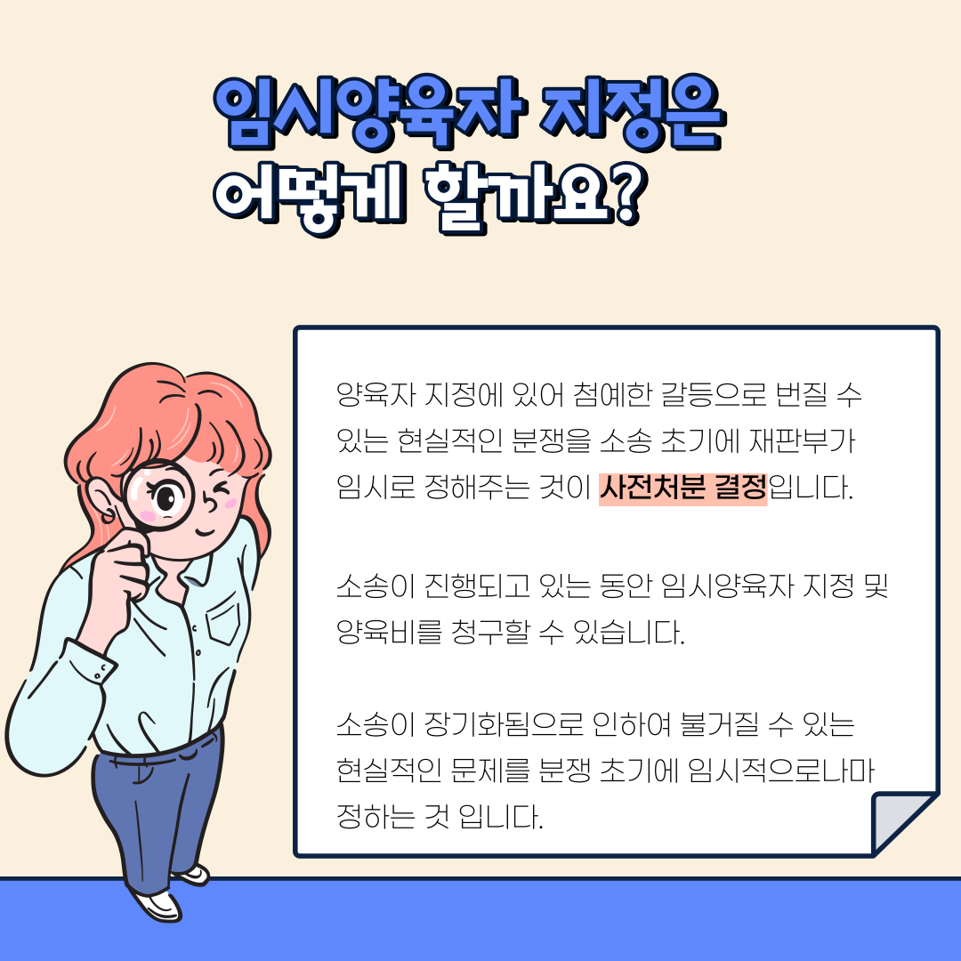 이혼 소송을 진행하는 동안에는 부부가 따로 거주하는 경우가 많습니다. 그래서 이때에는 일방이 자녀의 양육을 담당하게 됩니다. 다만 경제적으로도 분리가 되는 시기라 양육비 부족으로 인하여 생활에 어려움을 겪을 수 있는데요. 임시 양육자 지정을 통해 자녀를 보호하는 것은 물론, 임시 양육비 지급으로 자녀의 안정을 도모할 수 있습니다. 이혼 소송은 빠르더라도 반 년 이상의 시간이 소모되기에 그동안 자녀에 대한 현실적인 문제를 처리할 수 있는 방법이죠.