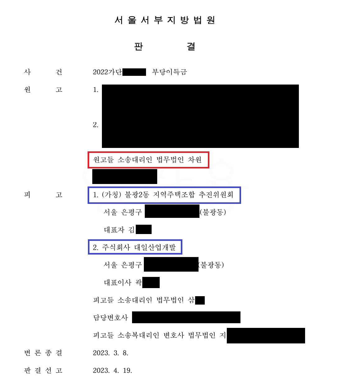 저를 찾아오신 의뢰인분들께서는 피고 불광2동 지역주택조합 추진위원회와 가입계약을 체결하시고, 확정분담금 및 환불보장 내용까지 있는 안심보장증서까지 교부하는 해당 지역주택조합사업이 정상적으로 진행될 거라고 믿은 채, 조합원 계약금 등의 명목으로 각각 수천만 원씩의 금원을 조합 측에 지급하셨습니다.