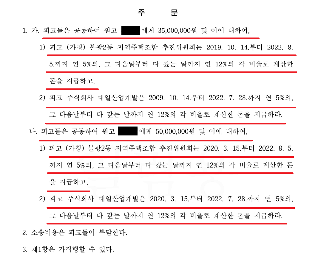 따라서 피고 불광2동 지역주택조합 추진위원회는 의뢰인들이 납부한 분담금을 부당이득으로 반환할 의무가 있고, 피고 주식회사 대일산업개발은 조합원 모집 및 계약체결 과정에 관여하여 의뢰인들에게 허위사실을 고지하게 하는 등 불법행위를 저질렀으므로 그에 따른 손해배상으로 피고 불광2동 지역주택조합 추진위원회와 공동하여 의뢰인들의 납입금을 지급할 의무가 있음을 적극 주장하여,