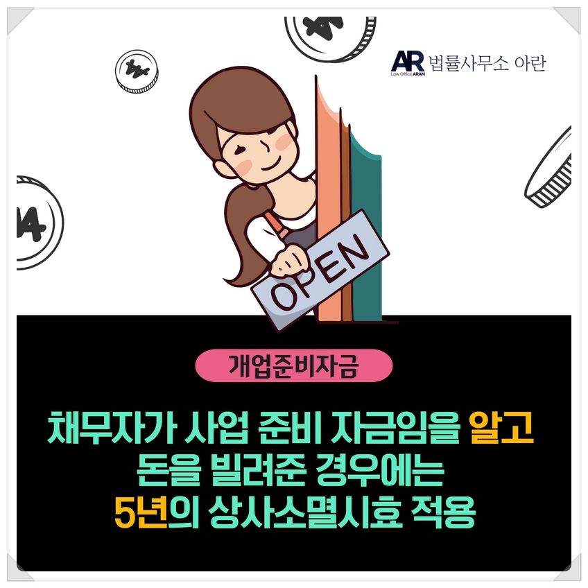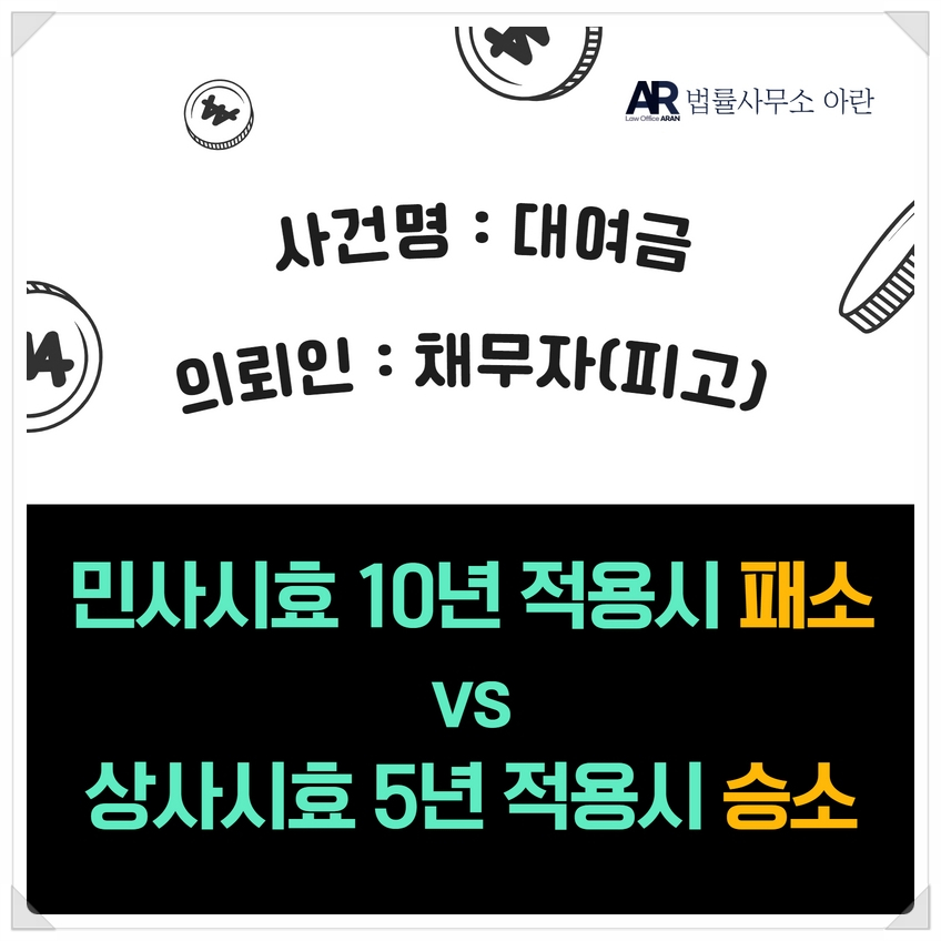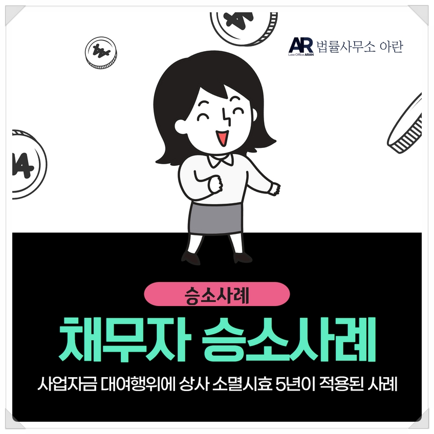 자 그렇다면 사업 준비 자금의 대여 행위를 두고 '채권자는 채무자가 사업 자금으로 사용하기 위하여 돈을 빌렸다는 사실을 인식하였다'라고 보아 5년의 소멸시효를 적용한, 법률사무소 아란의 실제 승소 사례를 살펴보겠습니다.