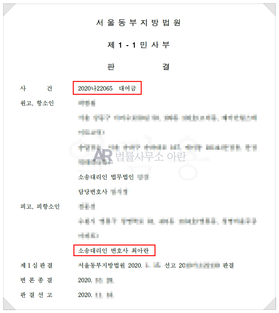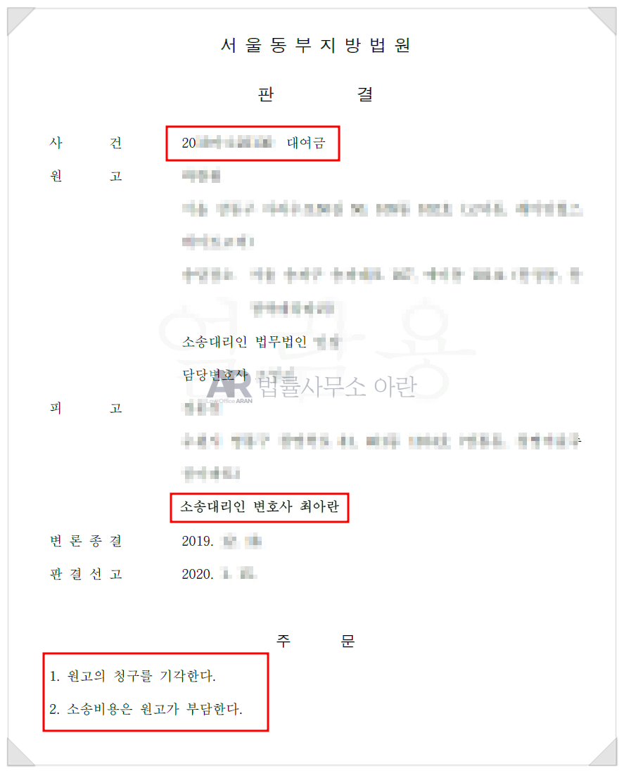 그 결과 1심 재판부는 최아란 변호사의 주장을 모두 받아들여 원고의 청구를 전부 기각했습니다. 즉, 의뢰인은 피고에게 돈을 갚지 않아도 된다는 판결이 선고된 것입니다. 아울러 재판부에서는 1심 소송비용을 전액 원고가 부담하라고 판결하였습니다.