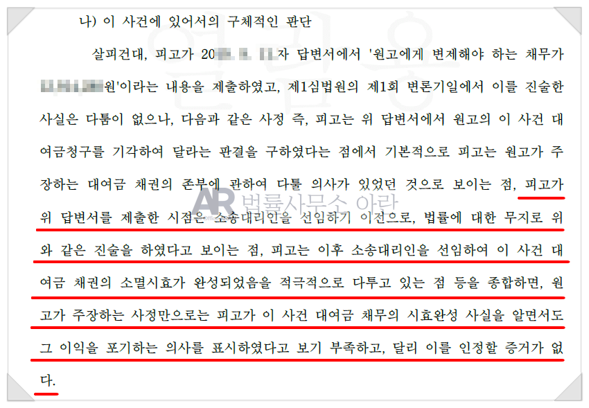 이번 포스팅에서는 소멸시효 주장을 통해 소송에서 승소하신 법률사무소 아란의 승소 사례에 대해서 살펴보겠습니다.