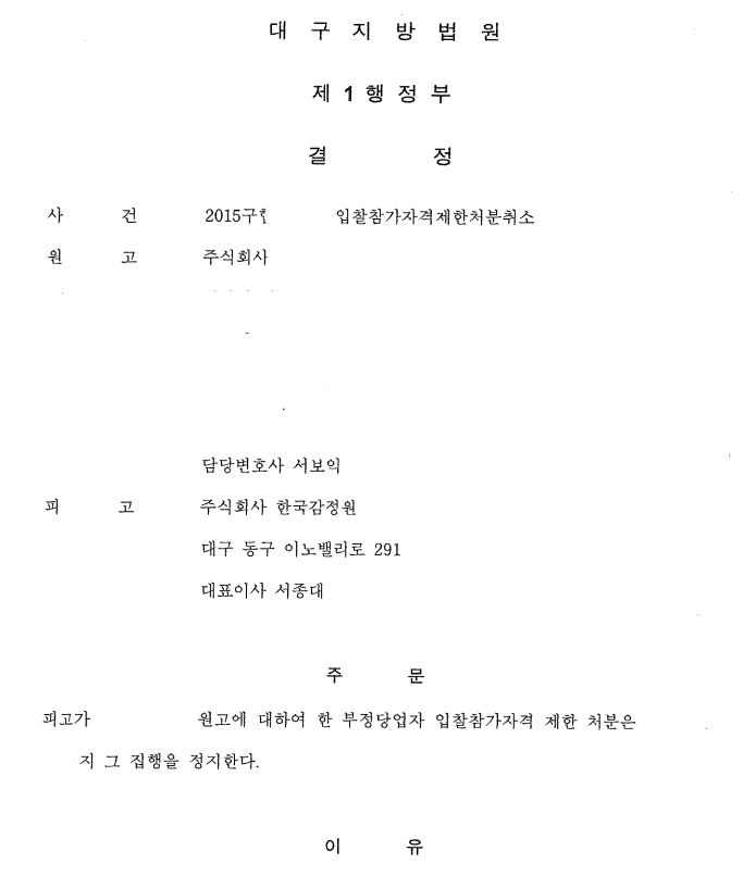 특히 위 사건에서는 처분이 내린 다음 주부터 이미 다른 입찰이 필요하였기에 입찰제한처분을 받자마자 변호사를 신속히 선임하여 두 가지의 집행정지를 받았습니다. 왜냐하면 심문기일이 필요한 집행정지로는 다음 입찰에 참가할 수 없어 회사가 도산의 위험에 빠질 수 있었기 때문에 일차적으로 특정일까지 집행정지를 하고, 이차적으로는 1심 판결 선고일까지의 집행정지를 하였습니다. 전자의 경우 심문기일 진행 없이 당일 집행정지를 하고, 후자의 경우 심문기일을 지정하여 심문절차를 거쳐 집행정지를 합니다. 위의 결정문은 판결선고시까지 집행정지 판결문이 아니라, 특정일까지의 집행정지로 심문절차 없이 판사가 다행히 신청서 제출 당일 집행정지 해 주셨습니다.